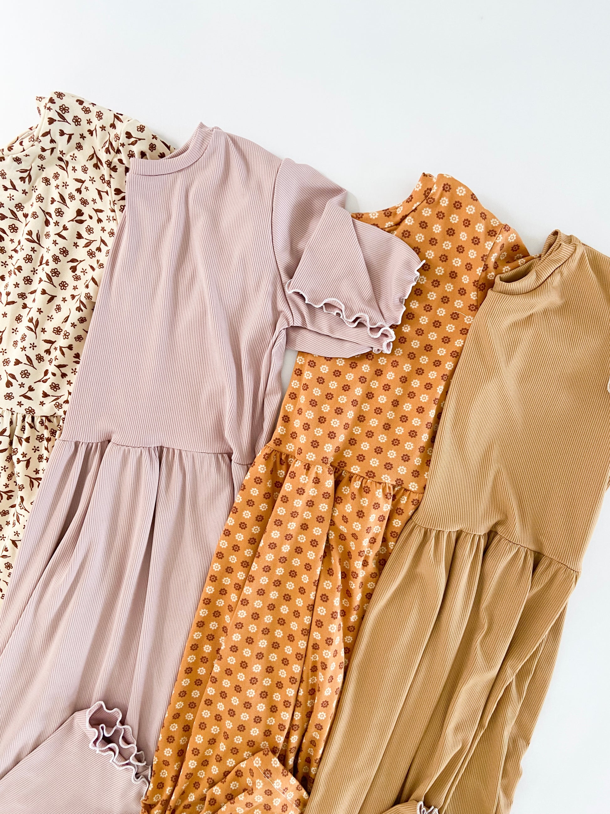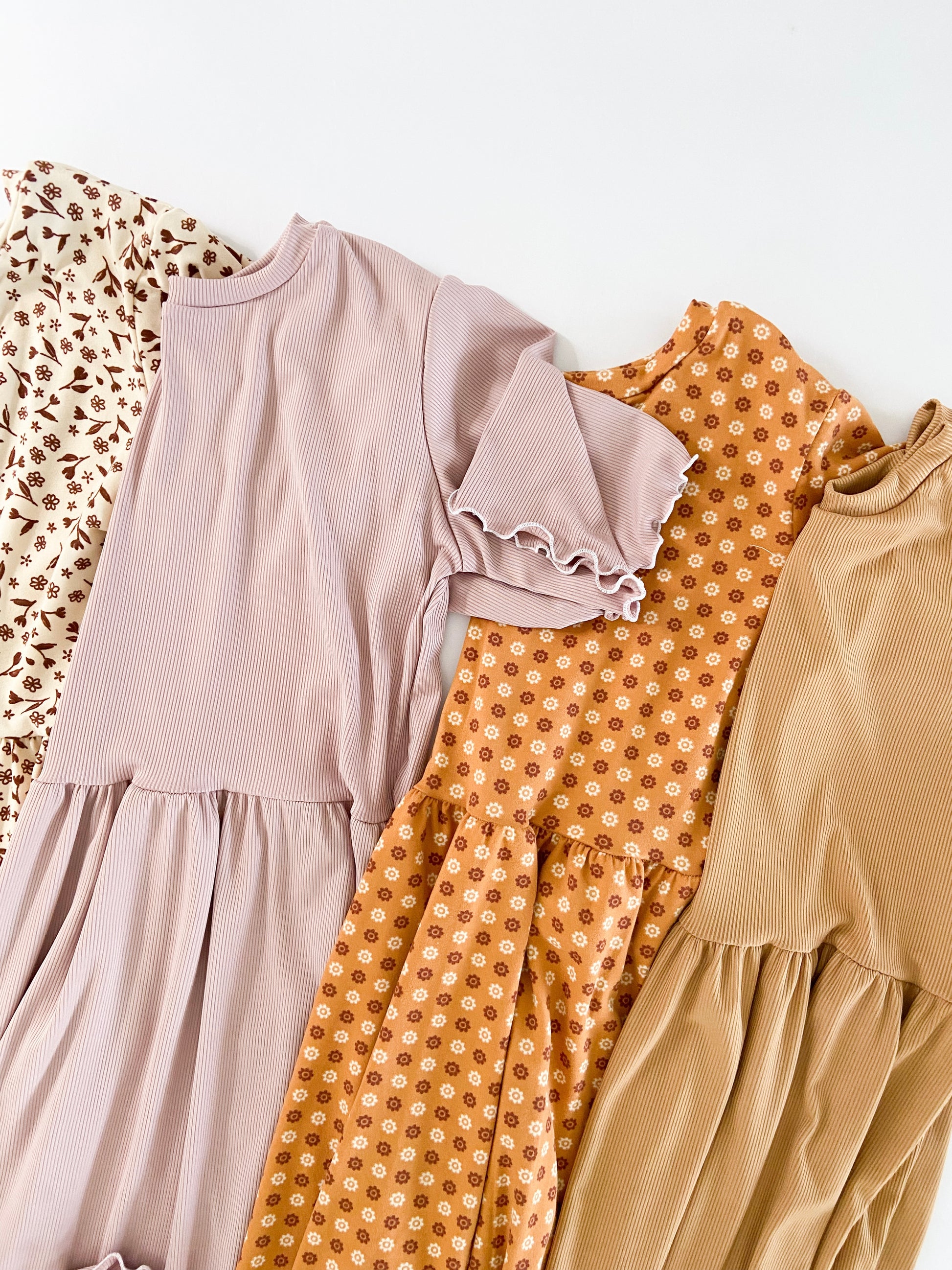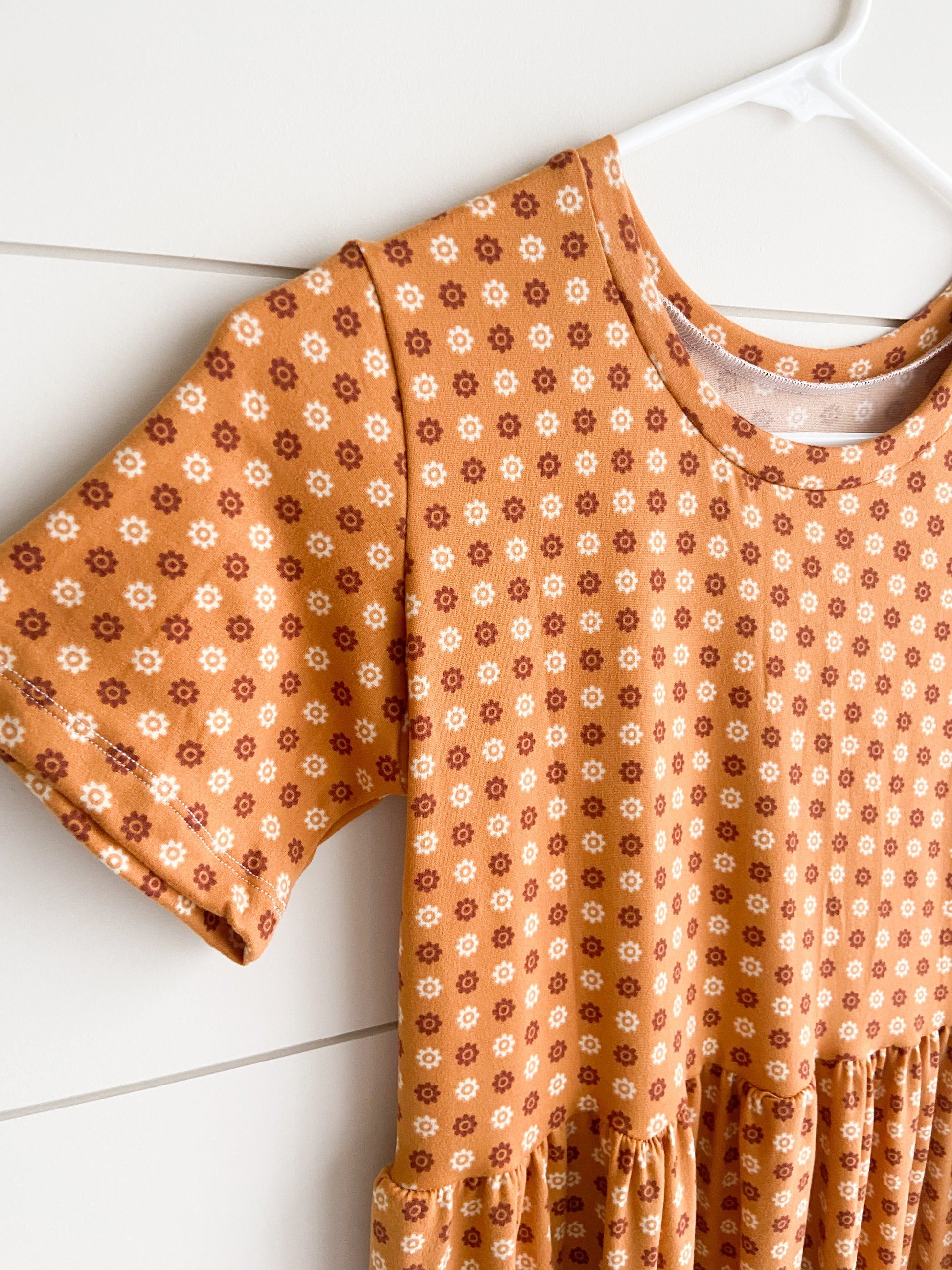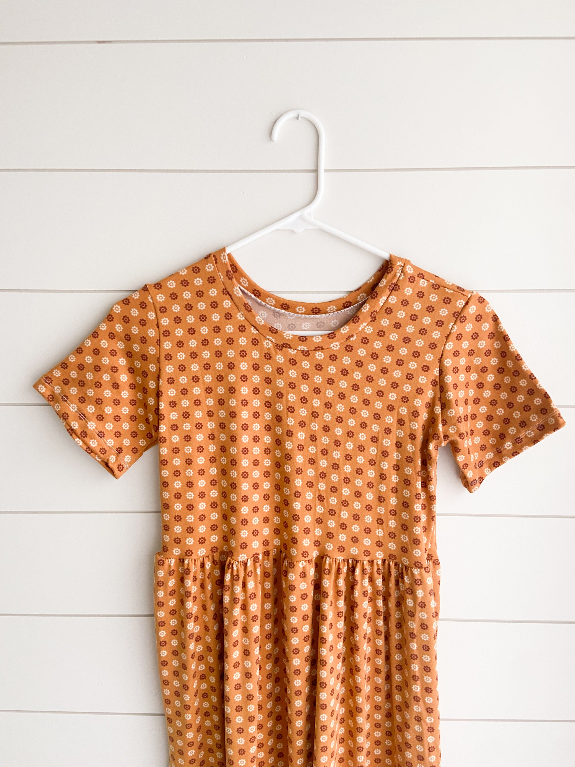 The most darling dress in a rich, ginger color featuring a retro florals on print. Layer this cute dress with a cozy cardigan for the perfect fall outfit! Made with a soft knit fabric.